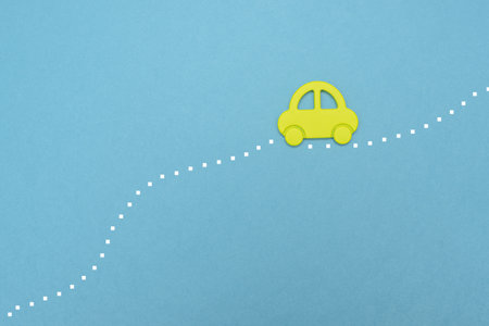 Placing car icon made of recycled cardboard on the table. Sustainable transport concept