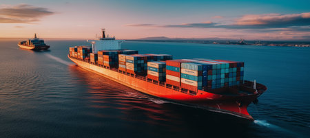 Container ships navigating through calm waters at sunset near a bustling port city, showcasing maritime trade and logistics