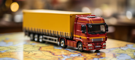 A hand delicately holds a miniature truck model over an abstract map, symbolizing logistics and global transport planning, ideal for travel and delivery themes.