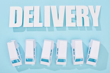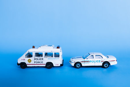 Toys of police cars on a blue light background. Teaching concept. Copy-space