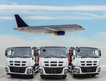 Three trucks are frontal front view and the plane is flying in the sky. Transportation concept.