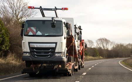 rear view of a big truck with flatbed trailer hauling tractor cabins on german autobahn