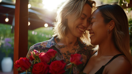 Close up of happy young lesbian couple together holding flowers. Engagement celebration. Pride concept. Generative AI.
