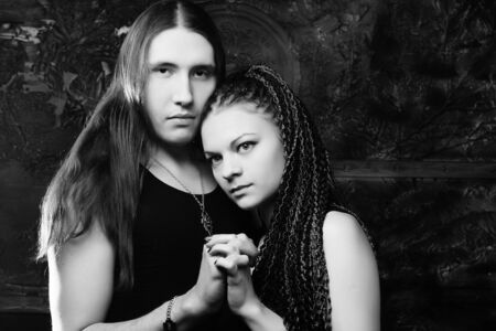 Portrait of a young tattooed punk couple of a girl and a guy with long dyed hair braided, lying on a large bed. Hugging each other. Stylish modern youth