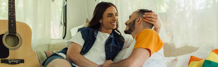 smiling gay man with tattoo looking at bearded boyfriend on bed near lgbt flag and acoustic guitar in van, banner