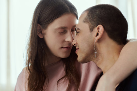 Two young men, a gay couple, relax in a bedroom with a calming atmosphere.