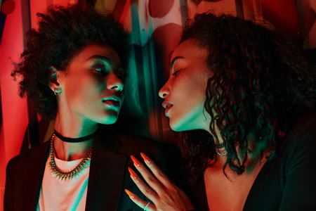 Two dark-skinned Latina lesbians are a couple and show their love with kisses and hugs to celebrate LGBTQ Pride