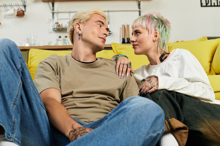 Happy young couple with tattoos and vivid colors short hair in an office. Generative AI AIG21.