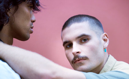 Portrait, diversity and fashion men outdoor against a wall space background with punk style, face and pride. Friends, lgbtq and gay couple or partner with cool style, hippy and fashionable together
