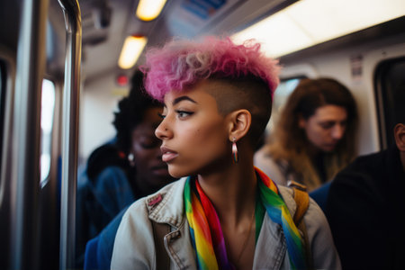 Beautiful african american woman with pink hair in train.