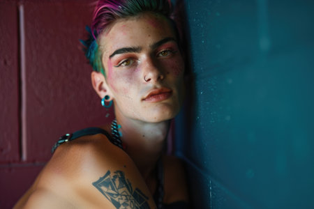 A man with tattoos and piercings leaning against a wall, exuding an aura of confidence and rebellion. His unique body art and body language depict a sense of individuality and strength.