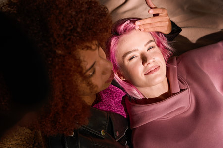 Romantic mixed-race lesbian couple resting outdoors in sunny weather