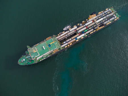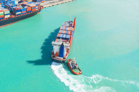 Container ship in import export and business logistic. The tug accompanies the ship when entering the cargo port. Aerial view