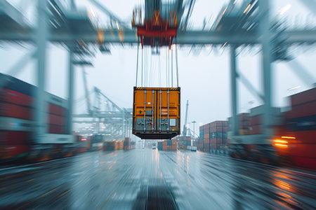 A dynamic scene of a shipping yard with a crane lifting a container, representing the complexity of logistics and transportation in an industrial environment.