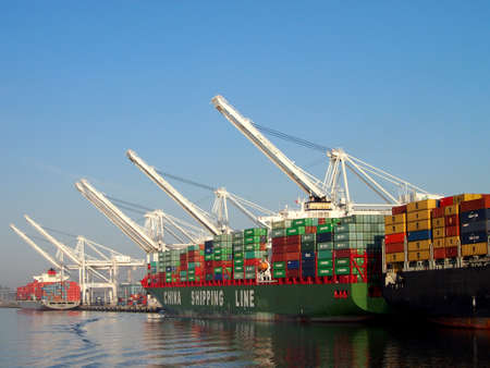 Oakland - November 14, 2011: China Shipping Line Shipping boat is unloaded by cranes in Oakland Harbor on a clear day. The fourth busiest container port in the country, it's a major economic engine in the San Francisco Bay Area.