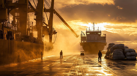 A stunning sunrise captures workers loading cargo at a shipping dock. The scene showcases industrial activity amidst vibrant colors and fog, highlighting the bustling maritime environment.