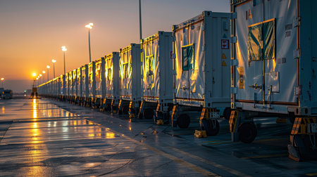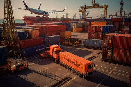 Witness the seamless movement of goods as containers are efficiently transported from the port to a cargo plane in this dynamic image. Trucks lined up, ready to embark on their journey, showcase the intricate logistics involved in global trade. The containers, securely stacked, symbolize the vast volume of goods being transported. This photograph captures the synchronized efforts and efficiency of the supply chain. Perfect for transportation, logistics, and business-related projects, this image encapsulates the seamless flow of commerce and the interconnected nature of the global economy.