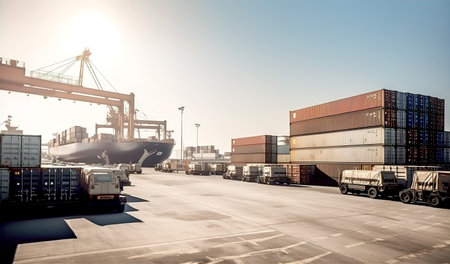 Container ship carrying heavy cargo unloading at Rotterdam commercial dock generated by artificial intelligence