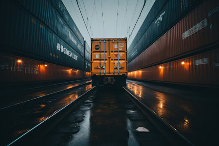 As dusk approaches, a yellow shipping container is positioned between two rows of dark cargo containers, reflecting the soft lights and creating a striking visual along the railroad tracks.