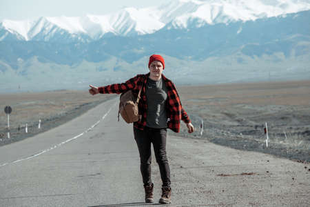 Man in shirt and backpack hitchhiking down on dusty road
