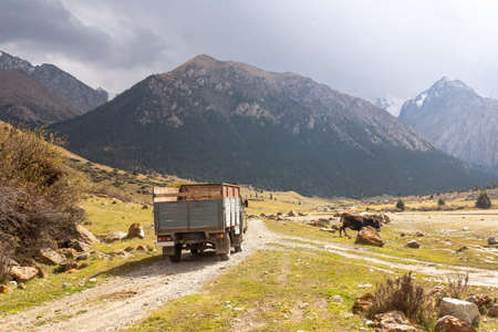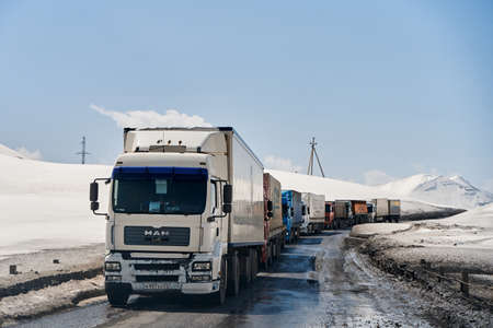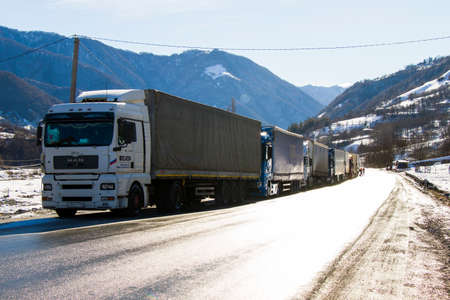 Gudauri, Georgia - February 06, 2021: Trailers on the road in Georgia, day and outdoor