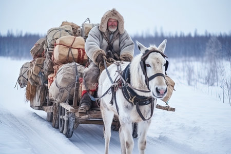 Amidst a heavy snowfall a group of fur clad warriors rides through a winter landscape. They navigate the terrain cold embodying the fierce spirit of the Nogai Kalmyk War.