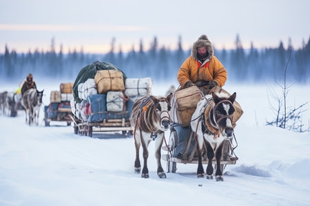 Many reindeer harnesses loaded with property are moving to a new camp site