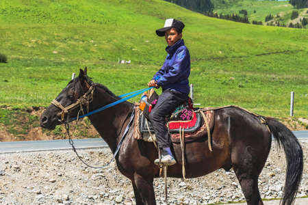 Xinjiang Province, China - 11th July 2014: A local Uyghur farmer boy on his horse turns for a photo