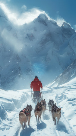 Experience the thrill of dog sledding in the serene, snowy wilderness, where a team of energetic dogs races through stunning landscapes with majestic mountains in the background.