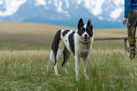 A hunting dog of black and white color stands against the background of snowy peaks. Traveling with a dog.