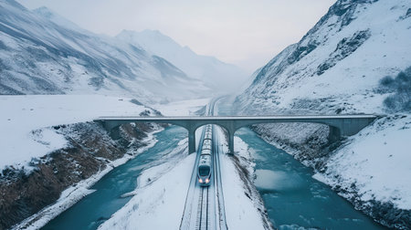A passenger train crosses a wide valley, flanked by towering snow-covered peaks. The serene winter scene is enhanced by a winding river beneath the bridge.