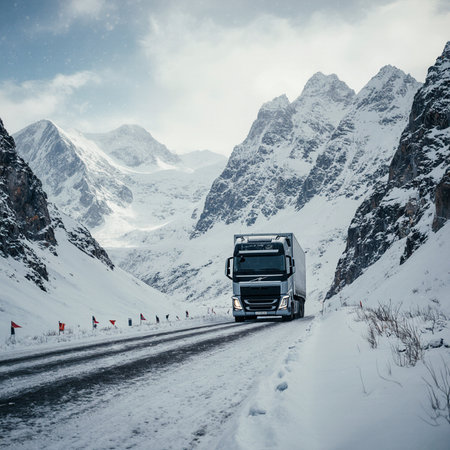 Truck driving on a mountain road in winter