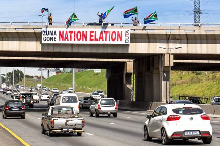 People waving flags and rejoicing above banner on motorway bridge.Johannesburg, South Africa -February 16, 2018.