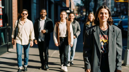 Group of young people walking in the city and looking at the camera