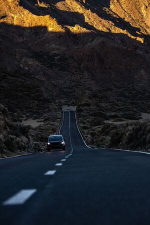 Long road in a mountain valley with a car on it - Teide National Park, Tenerife, Canary islands