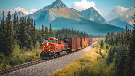 A vibrant freight train winds its way through a breathtaking mountain landscape filled with lush trees, under a clear blue sky, showcasing serene natural beauty.
