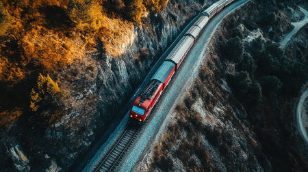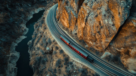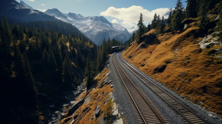 Generative AI Drone footage of a railway line hugging the contours of rugged peaks, illustrating the train's path amidst majestic scenery.