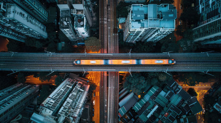 Aerial top view of a train riding on the elevated track with residential buildings at sides. Big city urban concept.