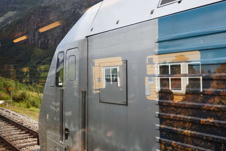 Flam train wagon in Norway. Norwegian tourism highlight. Railway station