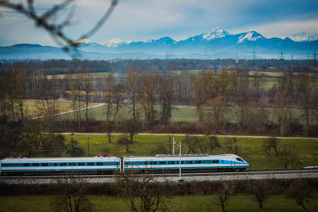 Tilting passenger train or express train, high speed train driving through the fields with magnificent view over the alps in cold autumn time.