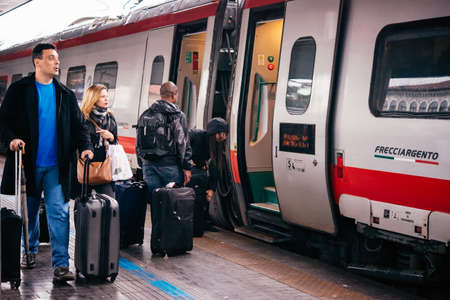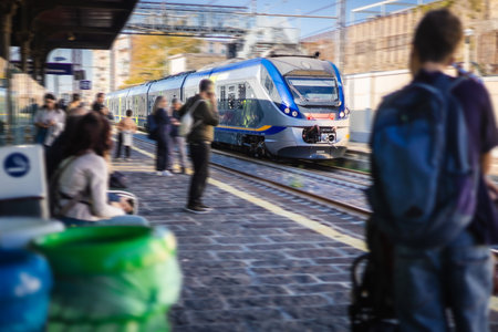 Modern italian train passing the train station of Pietrarsa, people waiting on the platform for a train. Train next to a platform near Napoli.