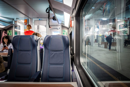 NOVI SAD, SERBIA - JUNE 25, 2022: seats in a modern intercity long distance train, a Soko From belgrade to Novi Sad of Srbija Voz, on a travel in a train station,stopped, waiting for departure.