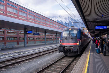 SALZBURG, AUSTRIA - March 03, 2018: Electric westbahn double decker train at the Salzburg main railway station (Hauptbahnhof).
