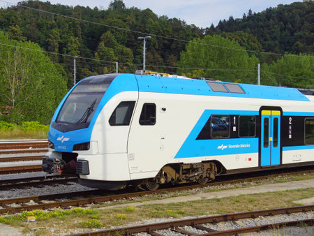 Celje, Slovenia - August 11, 2022: Slovenian Railways electric public transport train standing in a railway station.