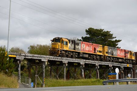 PAROA, NEW ZEALAND, NOVEMBER 18, 2017: A freight train crosses an old wooden bridge near Paroa, New Zealand