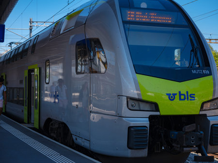Bern, Switzerland - July 6 2022: public transport in the city. BLS train at railway station Wankdorf at City of Bern on a sunny summer day.