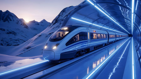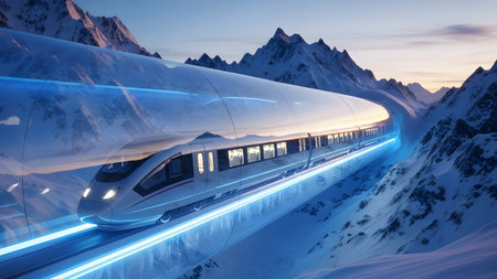 A futuristic high-speed train emerges from a glowing tunnel into a snowy mountain landscape at dawn