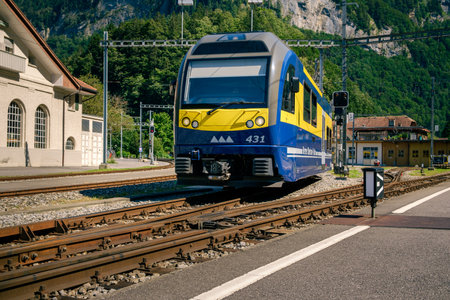Zweilütschinen, Bernese Oberland, Switzerland, August 4 2019: modern blue and yellow train from Berner Oberland Bahn entering the railway station on a sunny day
