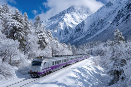 A train travels along a snowy path surrounded by majestic mountains and evergreen trees on a winter day.