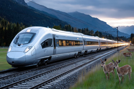 A high-speed bullet train rushing through a rural landscape, symbolizing progress and speed, shot at dusk, using a long exposure, with a herd of deer crossing the tracks